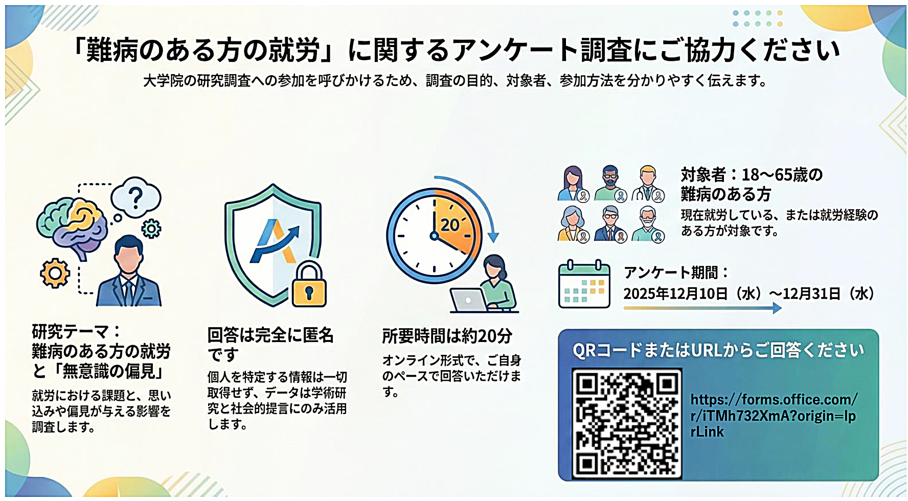 拝啓 時下ますますご清祥のこととお慶び申し上げます。 立命館大学大学院 経営管理研究科 経営管理専攻2回生の佐藤亮太(勤務先:一般社団法人日本血液製剤機構)と申します。 このたび、「難病のある方の就労状況とアンコンシャスバイアス(思い込み・偏見)に関する研究」をテーマに、アンケート調査を実施する運びとなりました。本研究は、難病のある方の就労における課題を明らかにし、無意識の偏見(アンコンシャスバイアス)が就労機会に与える影響を検討することを目的としています。 本調査は、以下の対象者を対象にオンライン形式で実施いたします。 アンケートは匿名で実施され、個人を特定できる情報は一切取得いたしません。所要時間は約20分程度です。ご回答は任意であり、途中での中止も可能です。調査結果は学術研究および社会的提言に活用し、希望者には研究結果の報告書をお送りいたします。 つきましては、ご本人におかれまして、本調査へのご協力を賜りたくお願い申し上げます。ご協力いただける場合は、以下のリンクよりアンケートにご回答いただけますと幸いです。
